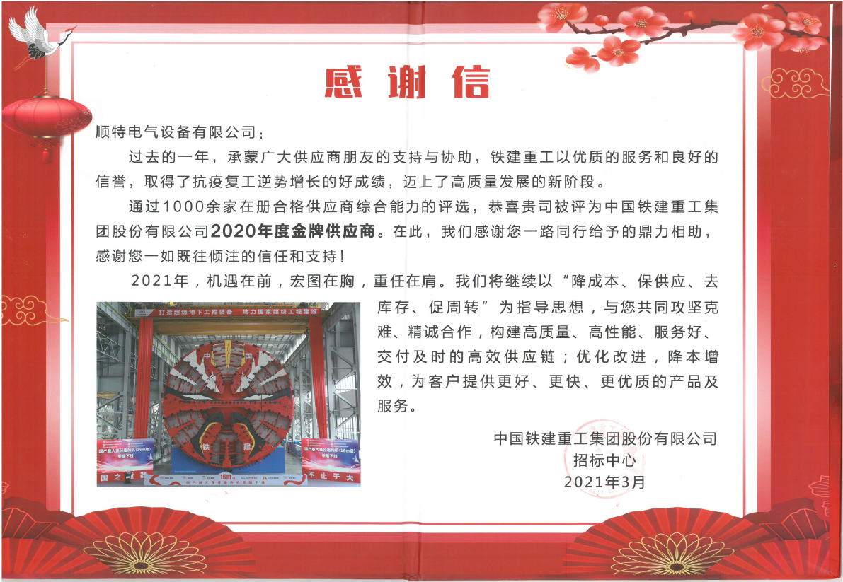中国铁建重工是Ebpay电气的重要战略客户,由最早的样机开发到如今的标准机型及项目专业定制产品,双方合作已长达10多年。2020年,疫情虽然给各行业带来了影响,但我司砥砺前行、无惧困难,与中国铁建重工共同努力,为客户提供高效优质的产品和服务,获得了中国铁建重工授予的“金牌供应商”称号。这一荣誉的获得离不开中国铁建重工对我司的信任和支持,体现了合作单位对我司产品与服务的充分肯定。