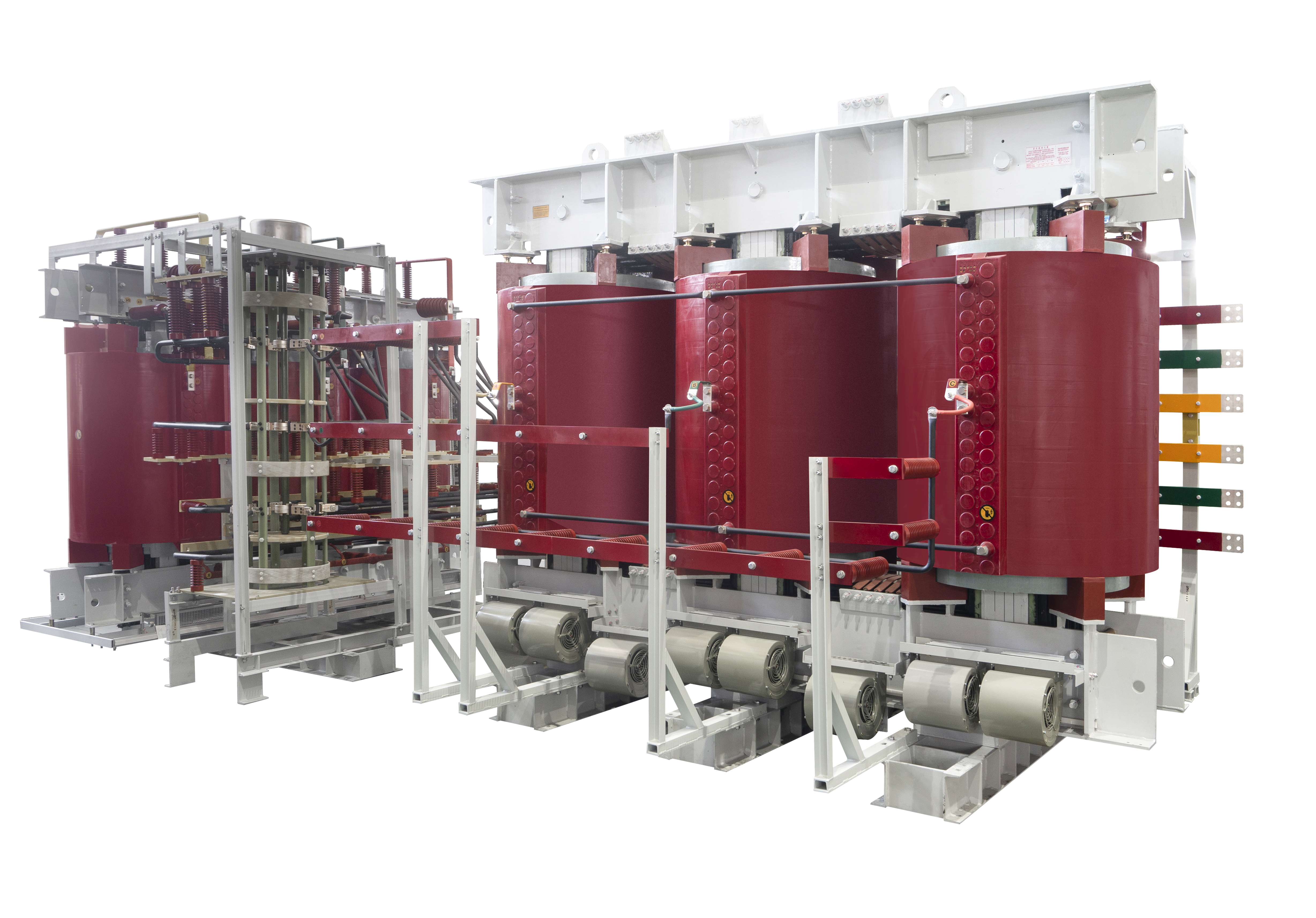 直流融冰配套用变压器为12脉波无励磁调压树脂绝缘干式整流变压器,其具有容量大、调压范围(7%~100%)、过负载能力强等特点。我司创新采用单独自耦调压变压器实现干式整流变压器的宽范围调压技术,配合无励磁分接开关快速方便调压,避免了拆装分接铜排调压带来的繁重工作量。
