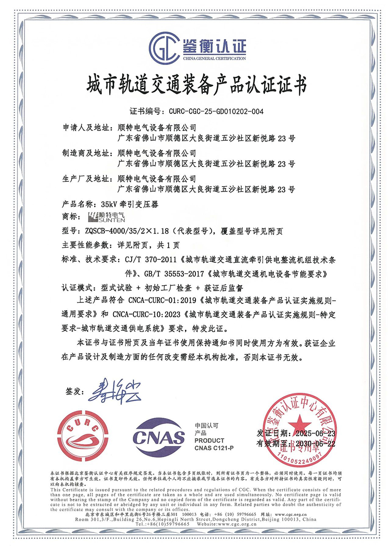 CURC产品认证是由国家认监委批准的针对城市轨道交通装备产品的认证体系,旨在提升产品质量安全水平。本次通过认证的35kV牵引变压器覆盖容量范围从1600kVA至4000kVA,满足CJ/T 370-2011《城市轨道交通直流牵引供电整流机组技术条件》和GB/T 35553-2017《城市轨道交通机电设备节能要求》的标准、技术要求。