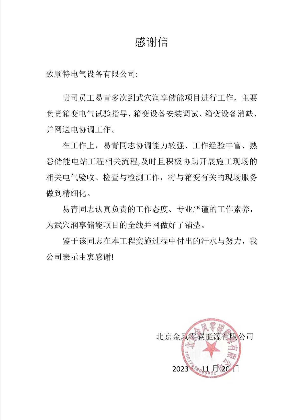 近日,Ebpay电气收到金风零碳能源发来的感谢信,对我司在武穴润享储能项目工程实施上的售后工作表示感谢,并充分肯定了我司的易青这位售后服务员工认真负责的工作态度和专业严谨的工作素养。感谢信中提到易青同志协调能力较强、工作经验丰富、熟悉储能电站工程相关流程,他多次到武穴润享储能项目现场,处理箱变电气试验指导、箱变设备安装调试、箱变设备消缺、并网送电协调等工作,及时协助了施工现场的相关电气验收、检查与检测工作的开展。
